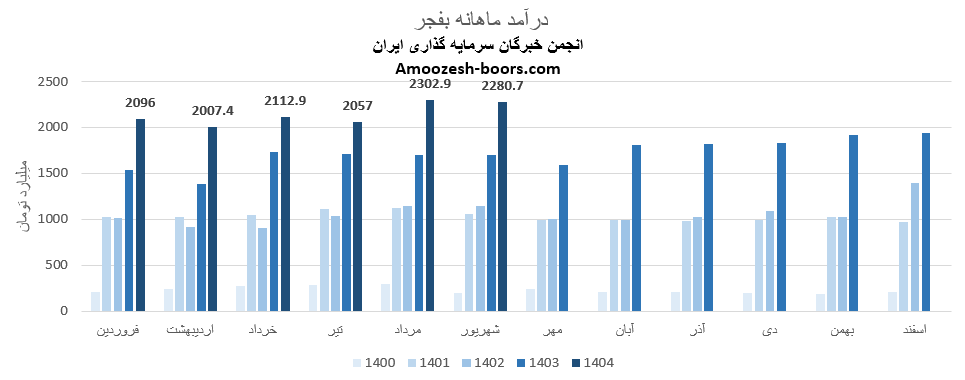 بر اساس صورت مالی و عملکرد ماهانه سهام بفجر که در کدال منتشر شده، این شرکت در این ماه توانسته به درآمد 2303 میلیارد تومان دست یابد، این عدد در مقایسه با ماه گذشته تغییر 12%+، در مقایسه با متوسط ماهانه 11%+ و در مقایسه با مدت مشابه 36%+ داشته است.