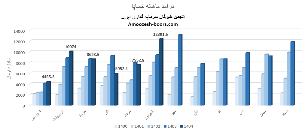 سهام خساپا از ابتدای سال مالی تا پایان مرداد 1404، مجموع درآمد ثبت شده شرکت به 36658 میلیارد تومان رسیده که نسبت به مدت مشابه سال گذشته 6 درصد افت داشته، و در همین حال 34 درصد از کل درآمد سال گذشته تحقق یافته است.