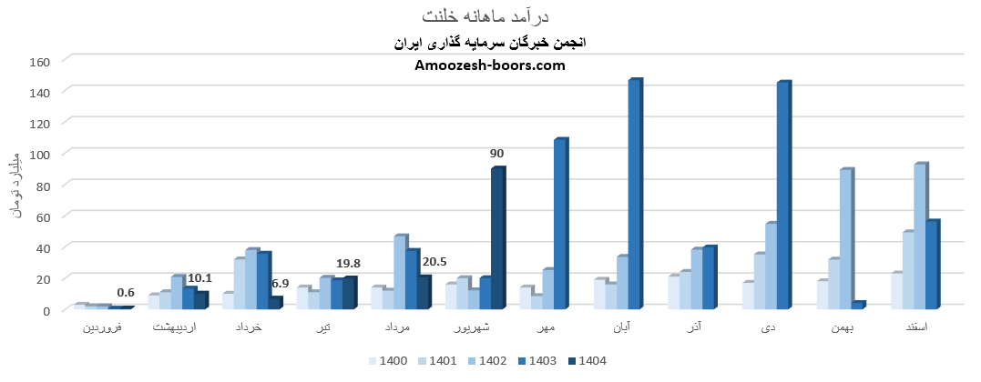 گزارش فعالیت ماهانه نماد خلنت در خرداد ماه سال 1404 نشان میدهد که این شرکت در این بازه زمانی توانسته است به درآمد 6.9 میلیارد تومان دست یابد، این رقم نسبت به ماه مشابه سال گذشته 81 درصد کاهش داشته است؛ همچنین در مقایسه با ماه گذشته و متوسط ماهانه به ترتیب تغییر32- و 29+ درصد داشته است.