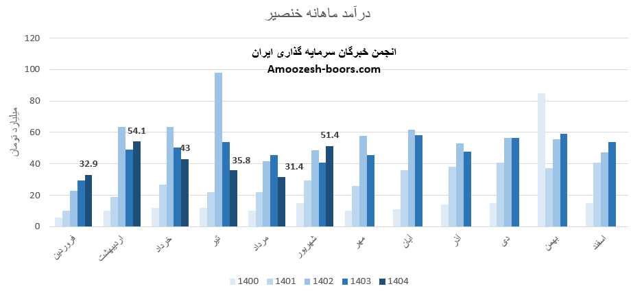 سهام خنصیر از ابتدای سال مالی تا پایان مرداد 1404، مجموع درآمد ثبت شده شرکت به 197 میلیارد تومان رسیده که نسبت به مدت مشابه سال گذشته 14 درصد افت داشته، و در همین حال 33 درصد از کل درآمد سال گذشته تحقق یافته است.