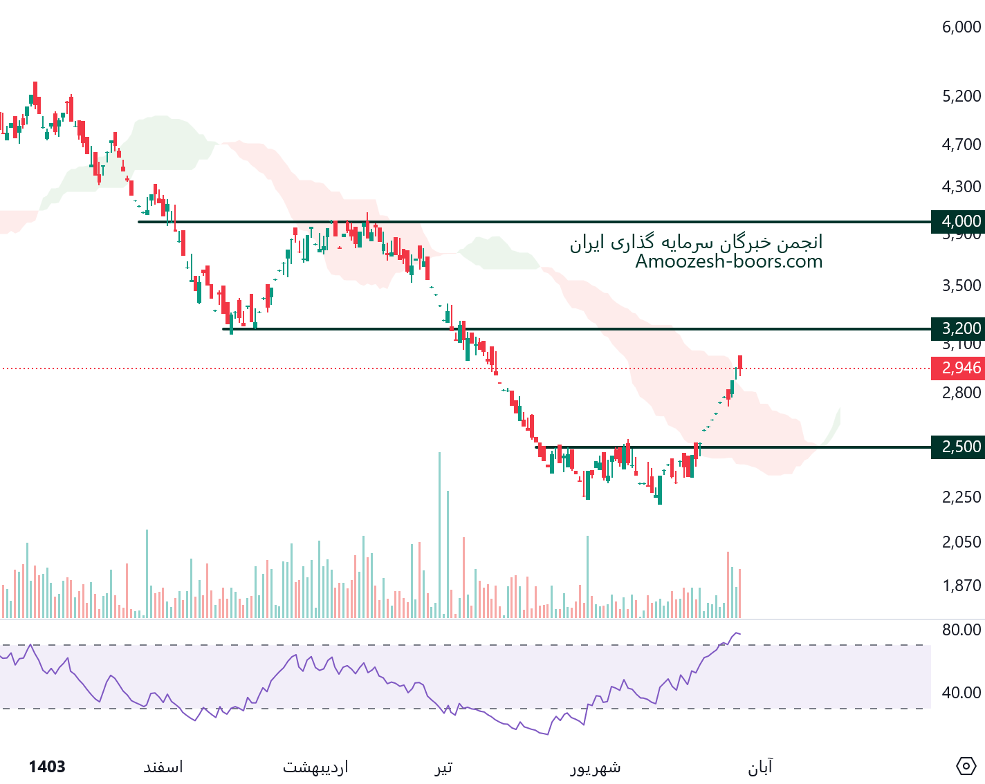 در صورت شکست مقاومت 320 و تثبیت بالای آن، می‌توان انتظار ادامه‌ی روند صعودی و رشد قیمت سهم تا مقاومت بعدی در محدوده‌ی 410 تومان را داشت.