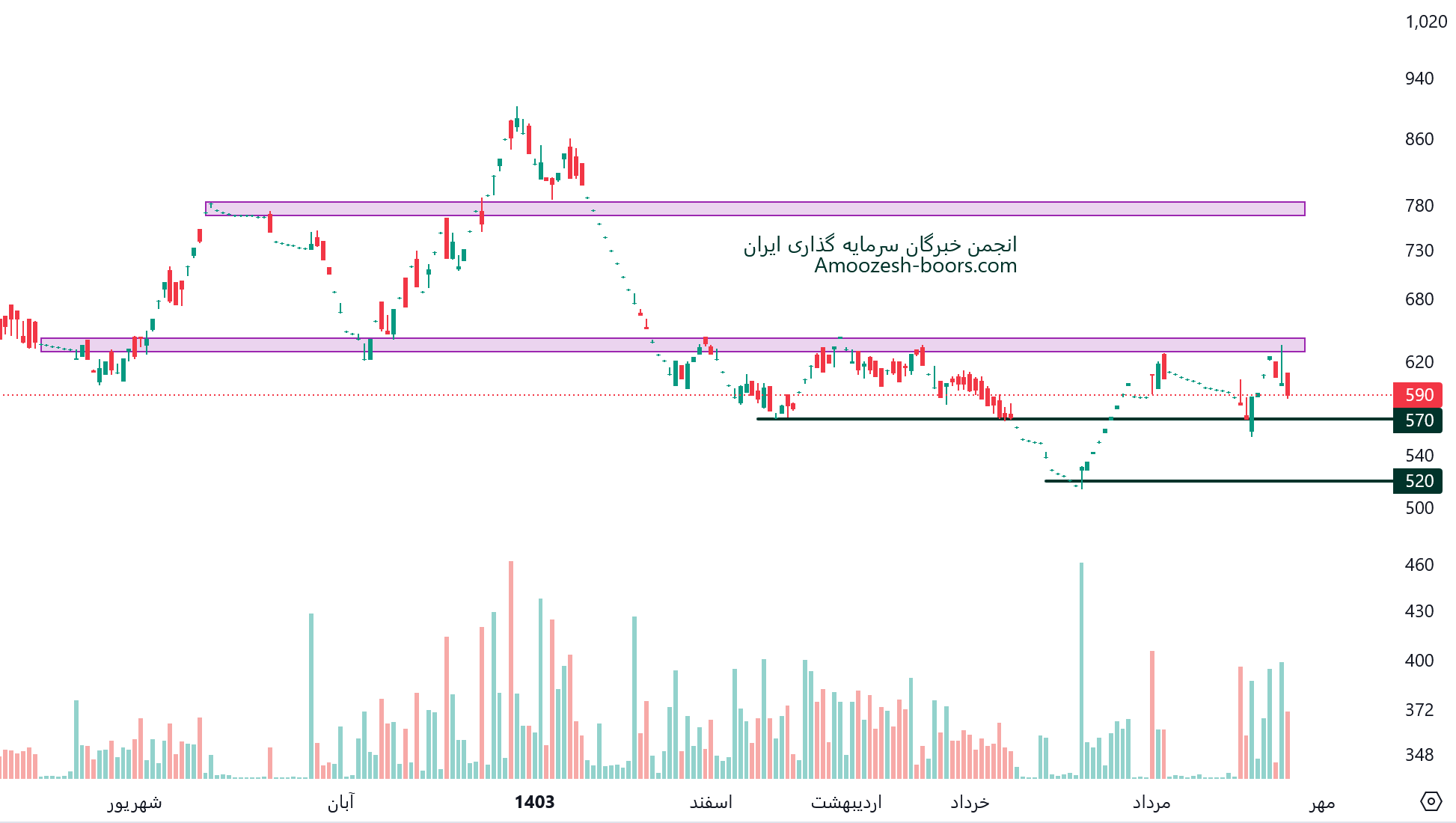 شکست حمایت 57 تومان، می تواند منجر به افت قیمت و ایجاد سیگنال فروش شود.