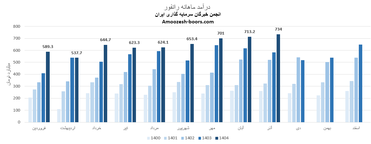 سهام رانفور از ابتدای سال مالی تا پایان آذر 1404، به درآمد 5821 میلیارد تومان رسیده که نسبت به مدت مشابه سال گذشته 17 درصد رشد داشته، و در همین حال 87% درصد از کل درآمد سال گذشته تحقق یافته است.