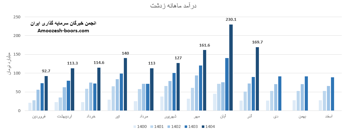 سهام زدشت از ابتدای سال مالی تا پایان آذر 1404، به درآمد 1262 میلیارد تومان رسیده که نسبت به مدت مشابه سال گذشته 49 درصد رشد داشته، و در همین حال 13% بیشتر از کل درآمد سال گذشته تحقق یافته است.