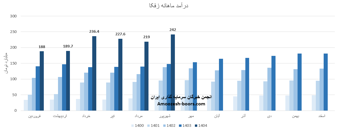 سهام زفکا از ابتدای سال مالی تا پایان مرداد 1404، مجموع درآمد ثبت شده شرکت به 1061 میلیارد تومان رسیده که نسبت به مدت مشابه سال گذشته 51 درصد رشد داشته، و در همین حال 57 درصد از کل درآمد سال گذشته تحقق یافته است.