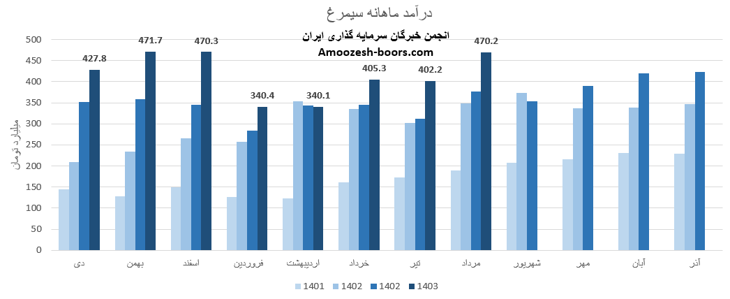 سهام سیمرغ از ابتدای سال مالی تا پایان مرداد 1404، مجموع درآمد ثبت شده شرکت به 3328 میلیارد تومان رسیده که نسبت به مدت مشابه سال گذشته 22 درصد رشد داشته، و در همین حال 77 درصد از کل درآمد سال گذشته تحقق یافته است.