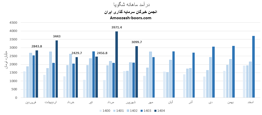 سهام شگویا از ابتدای سال مالی تا پایان مرداد 1404، مجموع درآمد ثبت شده شرکت به 15145 میلیارد تومان رسیده که نسبت به مدت مشابه سال گذشته 31 درصد رشد داشته، و در همین حال 48 درصد از کل درآمد سال گذشته تحقق یافته است.