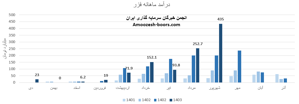 بر اساس گزارش فعالیت سهم فزر که در کدال منتشر شده، این شرکت در این ماه توانسته به درآمد 435 میلیارد تومان دست یابد، این عدد در مقایسه با ماه گذشته تغییر 72%+، در مقایسه با متوسط ماهانه 462%+ و در مقایسه با مدت مشابه 118%+ داشته است.