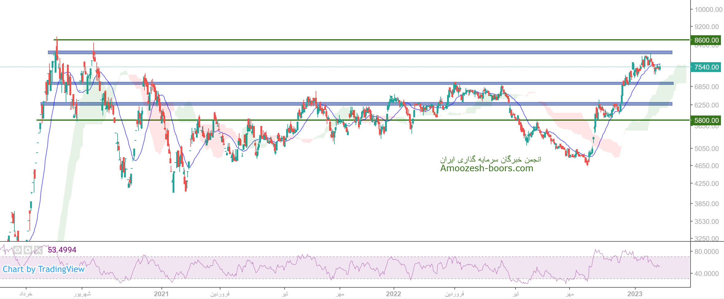 قیمت پس از رشد 70 درصدی ک داشته با فشار فروش مواجه گردیده، در صورت اصلاح، اولین حمایت سهم 7000 ریال در نظر گرفته خواهد شد، همچنین در صورت ادامه دار شدن روند صعودی، حرکت سهم به ترتیب تا 8100 و 8600 ریال محتمل خواهد بود.