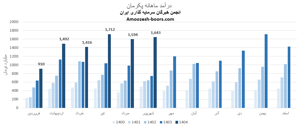 بر اساس صورت مالی و عملکرد ماهانه سهام پکرمان که در کدال منتشر شده، این شرکت در این ماه توانسته به درآمد 1711.7 میلیارد ریالی دست یابد، این عدد در مقایسه با ماه گذشته 21+ درصد، در مقایسه با مدت مشابه سال گذشته 65+ درصد و در مقایسه با متوسط ماهانه 35+ درصد بوده است.