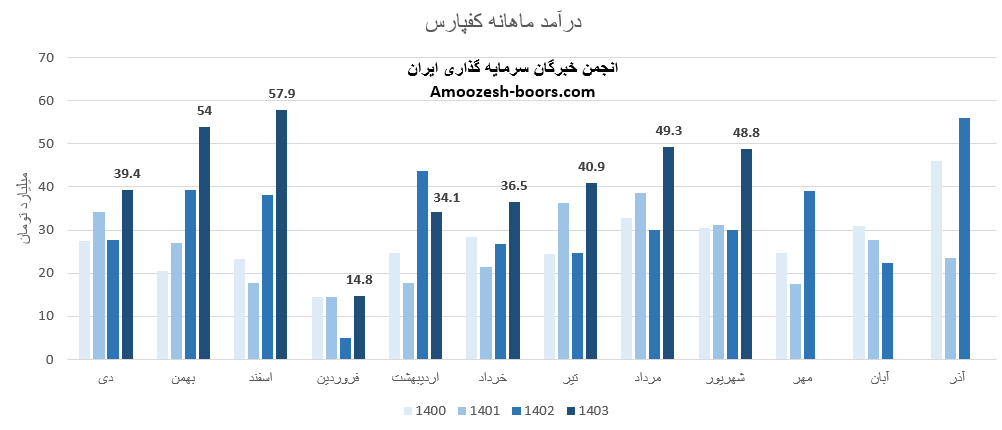 سهام کفپارس از ابتدای سال مالی تا پایان مرداد 1404، مجموع درآمد ثبت شده شرکت به 327 میلیارد تومان رسیده که نسبت به مدت مشابه سال گذشته 39 درصد رشد داشته، و در همین حال 85 درصد از کل درآمد سال گذشته تحقق یافته است.